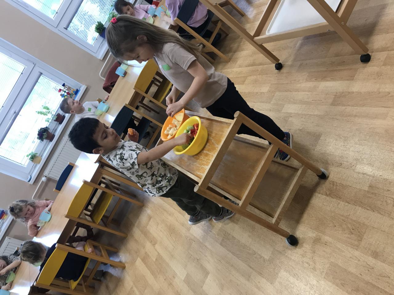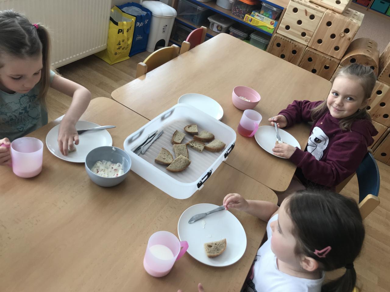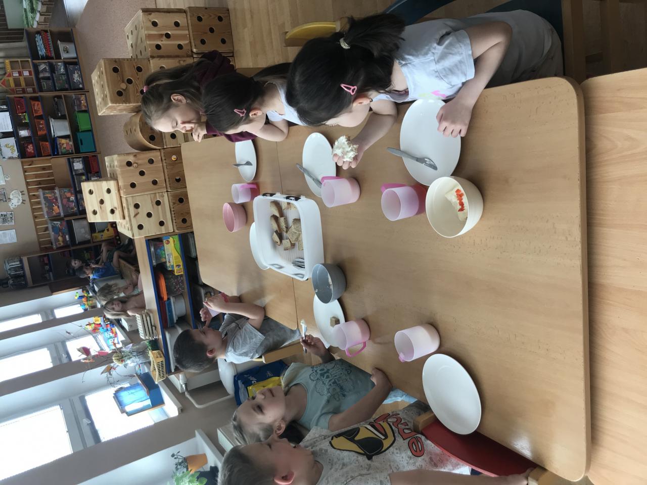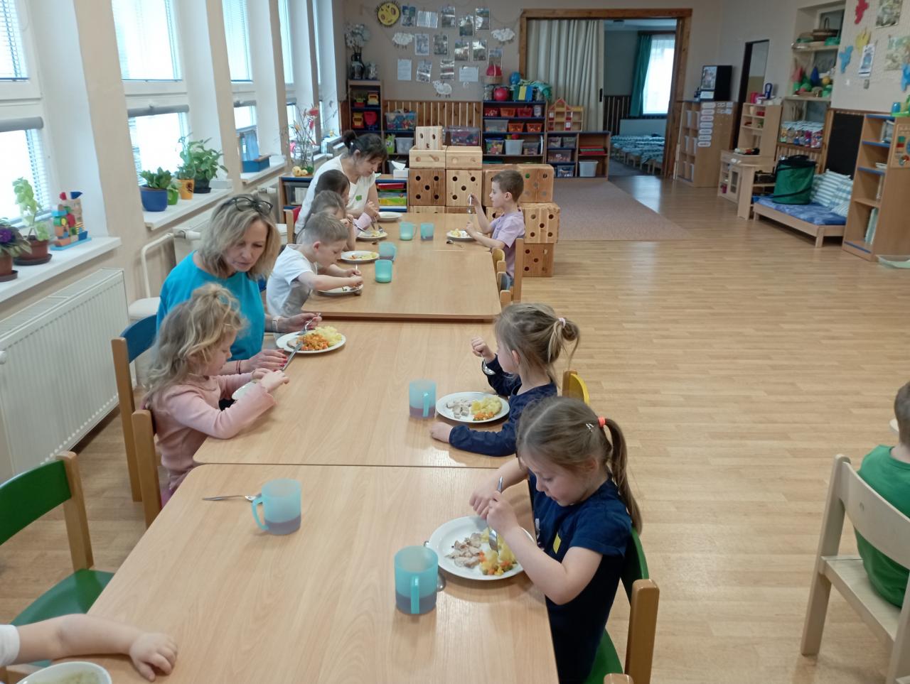 ...porci si děti vybírají očima, v případě jakékoliv potřeby mohou požádat o menší kousek ( rozvíjíme tím komunikaci a slušnost, slovo prosím a děkuji by mělo být samozřejmostí). Při svačinkách se děti obsluhují samy, při odpoledních mažou pečivo připravenou pomazánkou....Snažíme se stolovat kulturně, všechny starší děti ( mimo malinkých) používají příbor - zvládnou-li sebeobsluhu lžící :)...I chvíle na jídlo skýtají množství situací k vytváření potřebných návyků do života - když něco potřebuji, umím se slušně domluvit, jsem ohleduplný a samostatně fungující človíček. A to je pak velká devíza do dalšího života :)